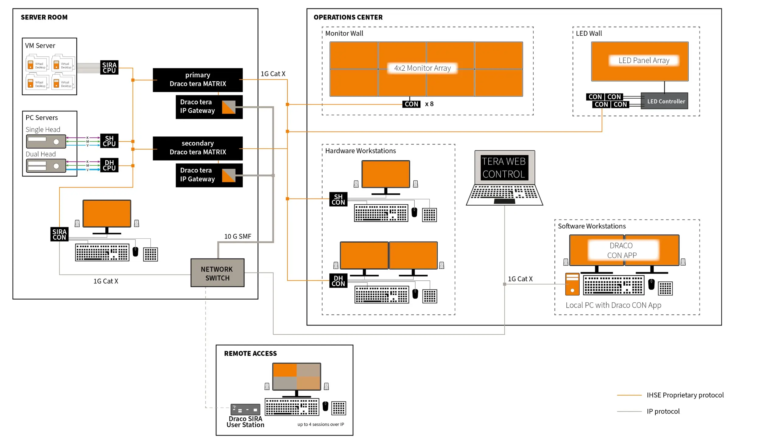 A secure connection point between matrices across multiple buildings, and LAN access to the KVM system.