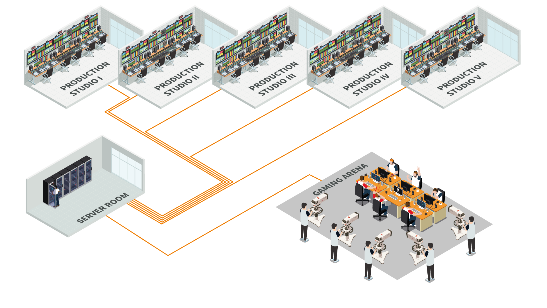 Das Sendezentrum enthält sechs unabhängige Regien, in denen die Live-Bilder aus der Veranstaltungshalle sowie den In-Game-Kamera-Videos der Spieler und Analysten zusammenlaufen. Die Regiemitarbeiter (Observer) müssen aus der Vielzahl der Videoquellen in Echtzeit das gewünschte Videomaterial auswählen, inklusive Rückblenden und Slow-Motion-Einstellungen von entscheidenden Spielszenen, das dann live über Twitch, teilweise auch über Youtube, FACEIT Watch und andere Plattformen weltweit gestreamt wird.