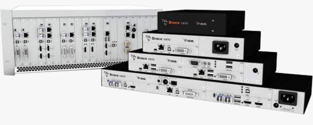 Für mittelgroße und große Anwendungen empfehlen wir unsere Draco tera flex KVM-Matrixswitch-Serie mit ihrer kompakten Größe von 1, 2 oder 4HE und bis zu 160 Flex-Ports und für sicherheitskritische Installationen unsere Draco tera enterprise KVM-Matrixserie mit bis zu 48, 80, 160, 288 und 576 Anschlüssen – jeweils frei definierbar als Ein- oder Ausgänge.