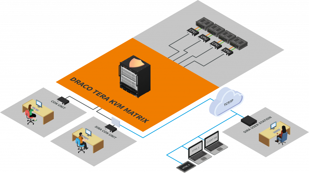 SIRA is an ideal complement to existing Draco tera KVM installations. It adds remote, IP-based connection capability over local- and widearea networks to KVM systems located at greater distances.