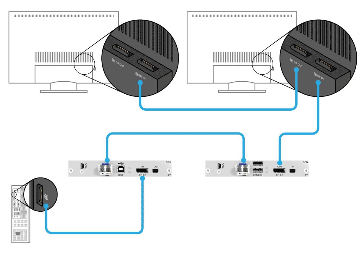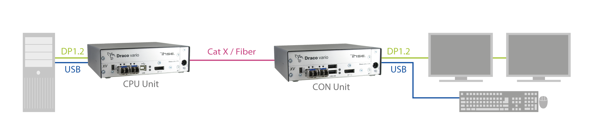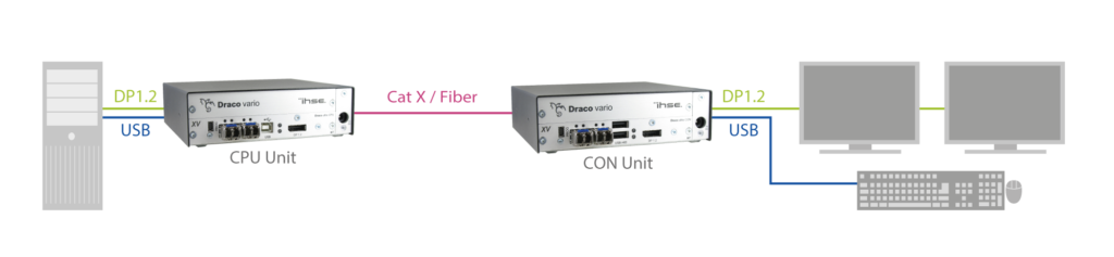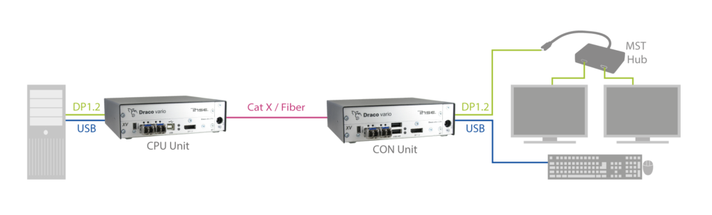The Draco ultra MST (Multi Stream Transport) Extender enables the remote operation of spatially separated computers and dual-screen workstations with two DisplayPort monitors, keyboard and mouse over a single fiber optic or Cat connection.