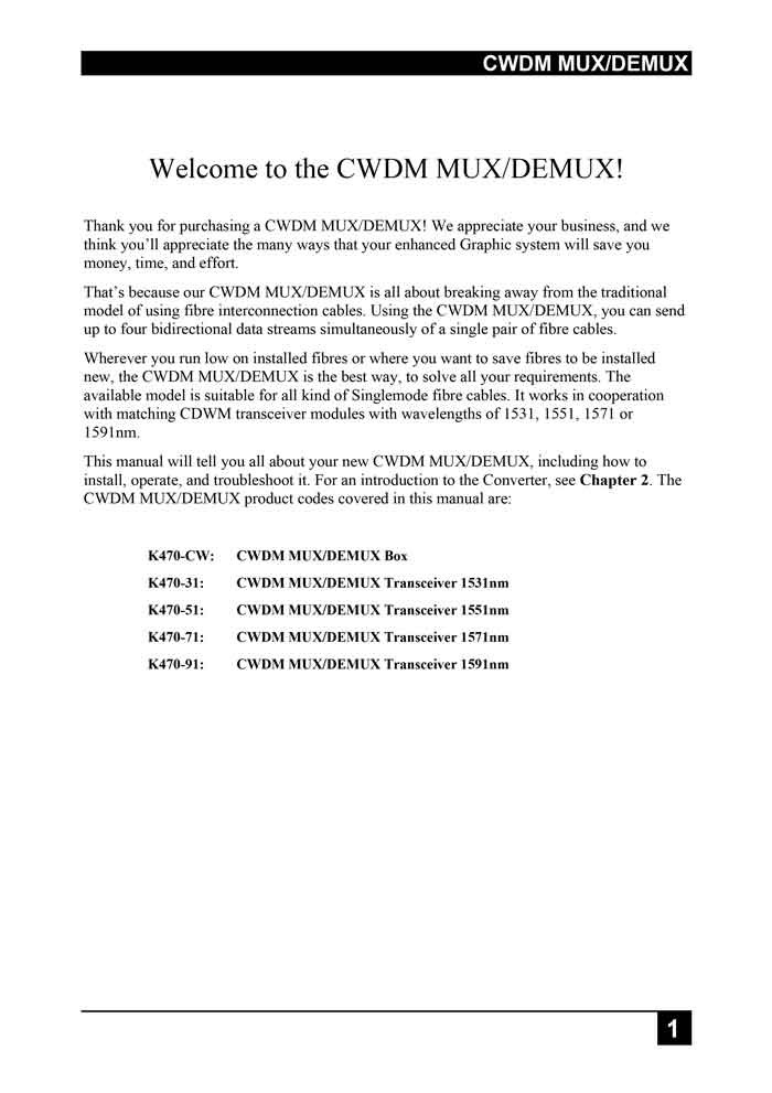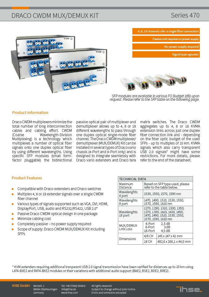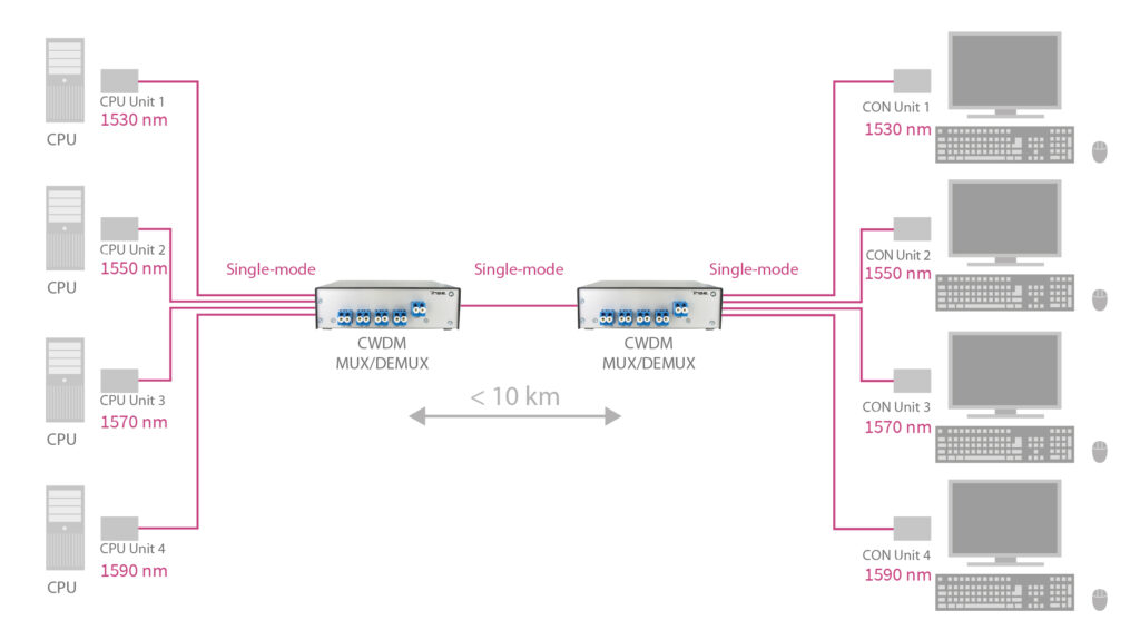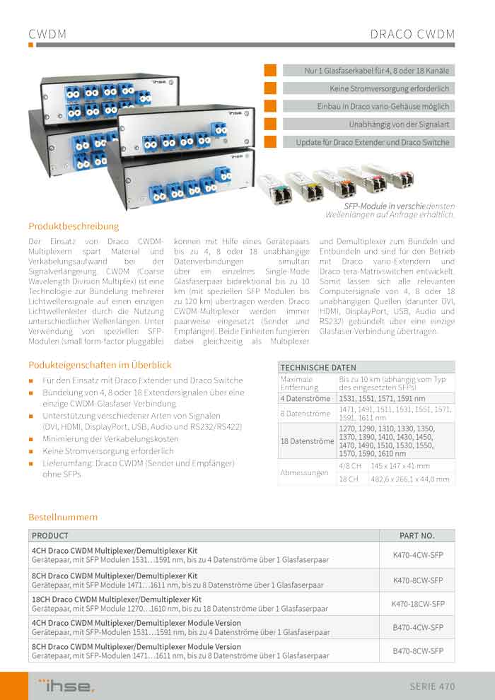The Draco CWDM multiplexer/demultiplexer kit can be installed in several types of Draco vario chassis and is designed to integrate seamlessly with Draco vario extenders and Draco tera matrix switches. The Draco CWDM is completely agnostic to the signal type being transmitted, allowing DVI, HDMI, DisplayPort, USB, audio and RS232 signals from 4, 8 or 18 different sources to travel up to 10 km over a single transceiver connection.