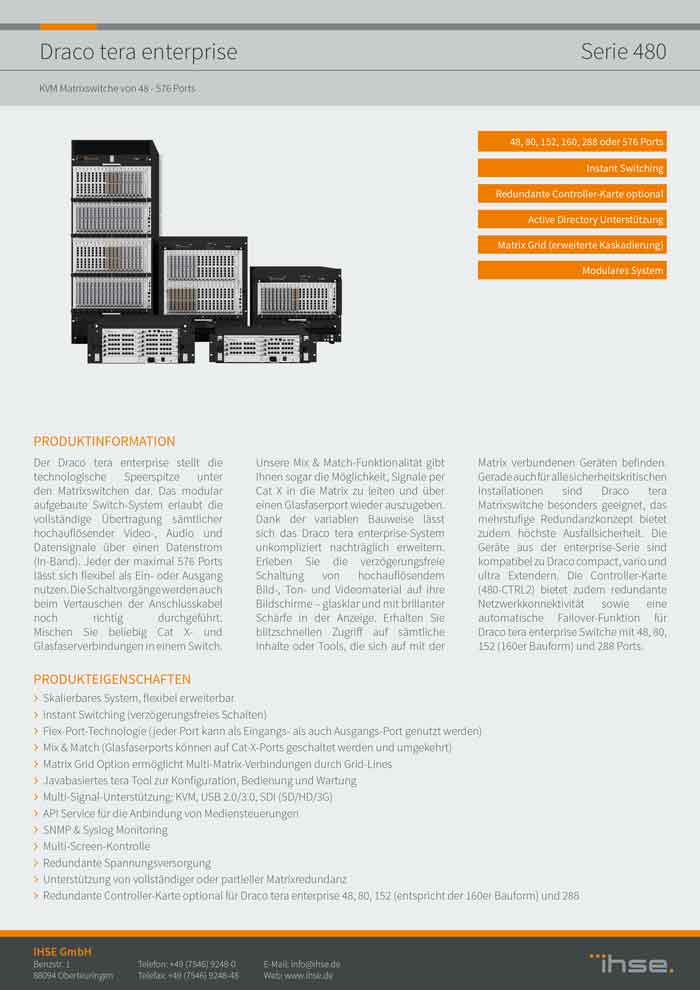 The Draco tera enterprise is a high performance, modular matrix system for bidirectional signal distribution of high definition video, audio, and data over Cat X, fiber optics and SDI. Available with up to 48, 80, 160, 288 and 576 I/O ports.