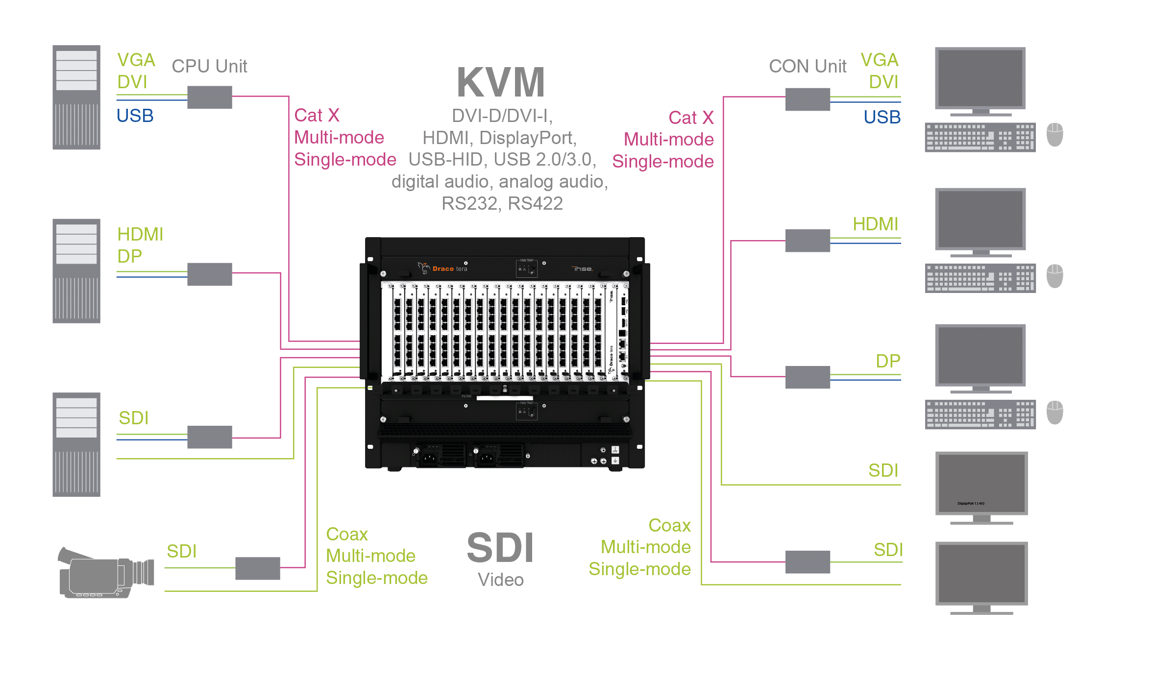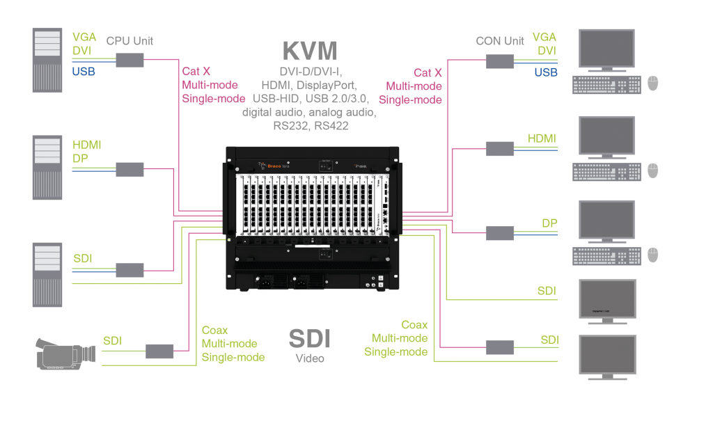 • Multi-signal support: KVM, USB 2.0/3.0, SDI (SD/HD/3G)