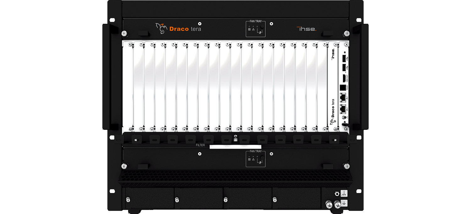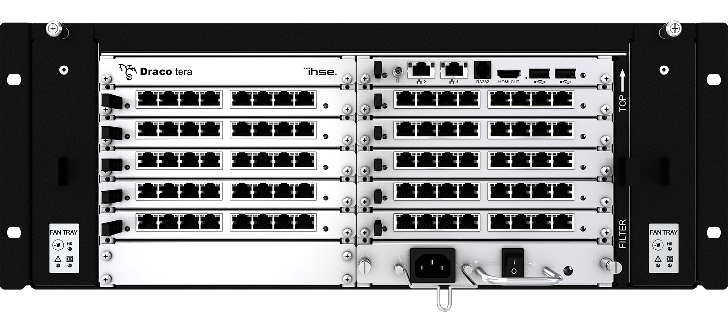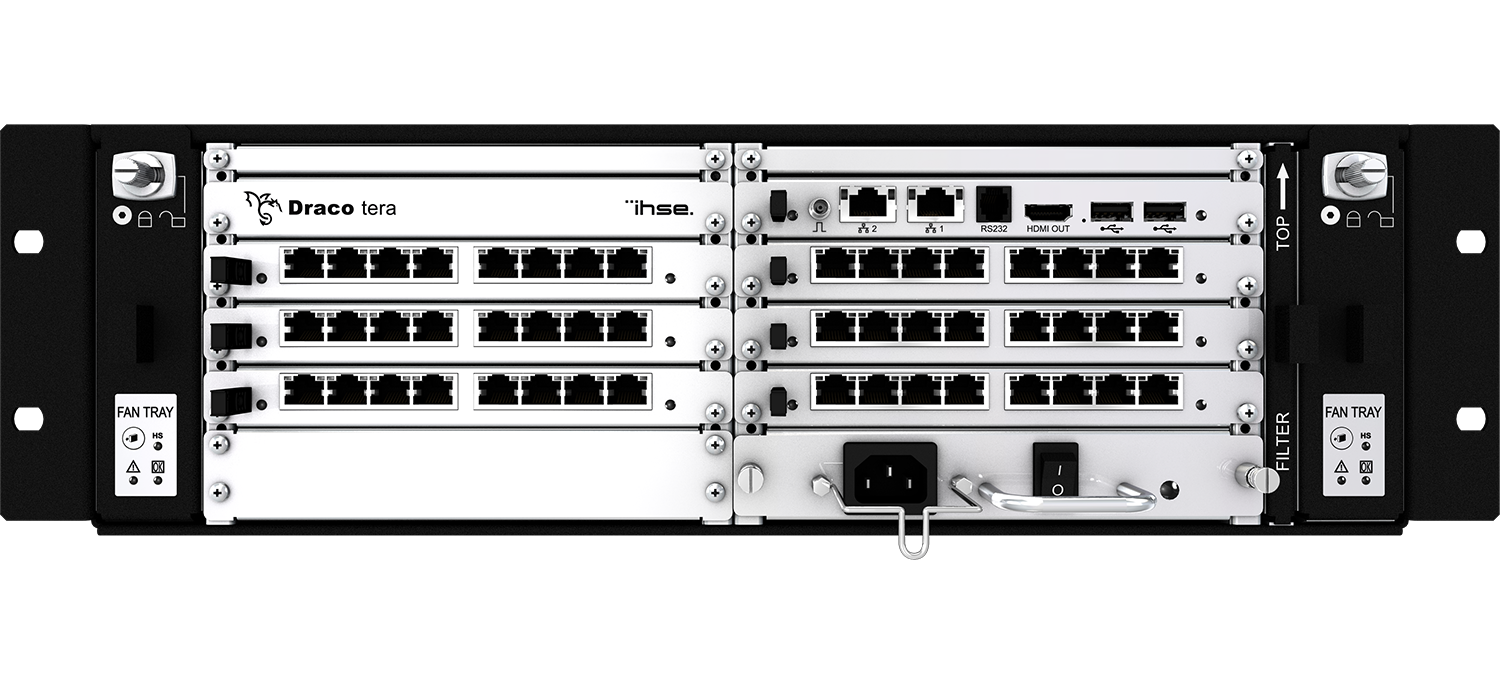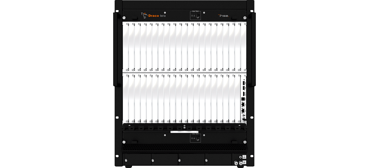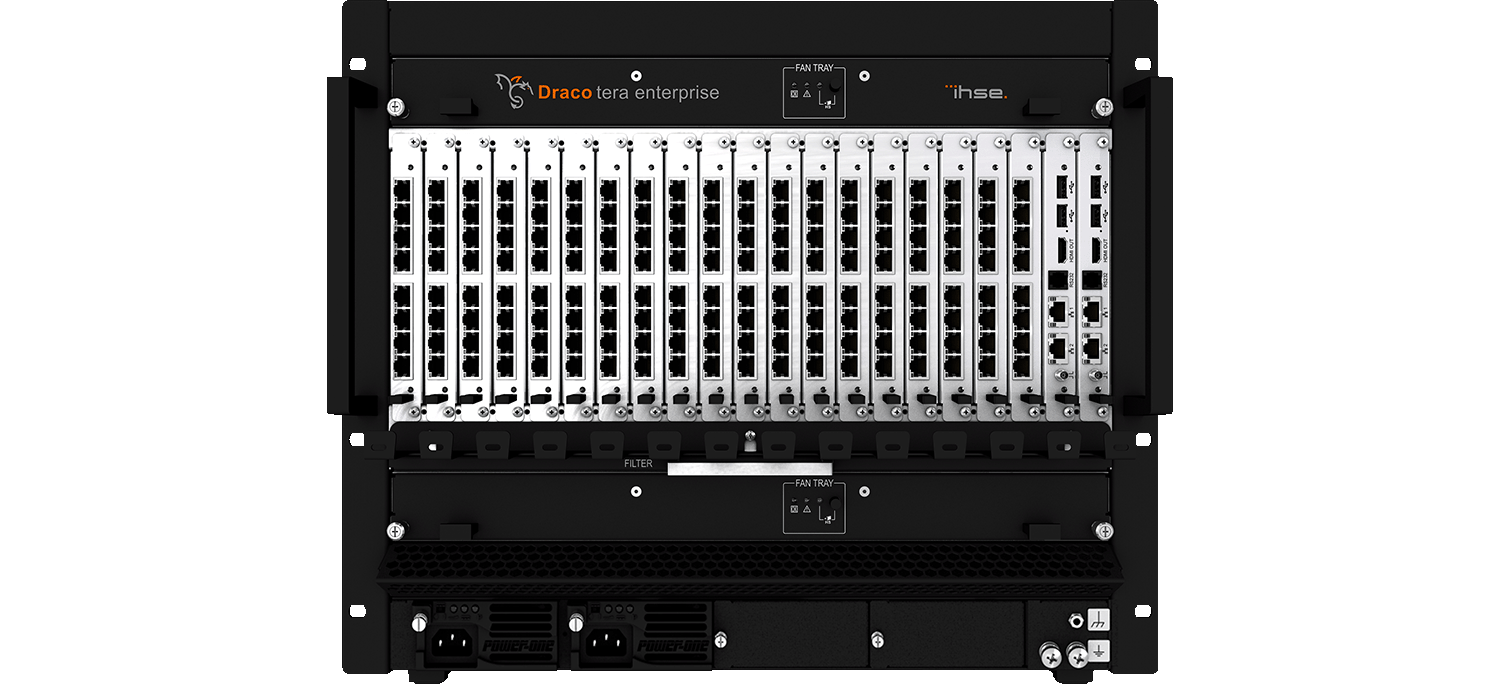 For mission-critical installations, Draco tera matrix switches are ideal. The multi-level redundancy concept of the Draco tera enterprise offers the highest level of reliability for 24/7 operation. Each Draco tera enterprise chassis supports fully redundant power and hot swappable modules for full service and field upgrades without interrupting signal flow. The Draco tera enterprise is compatible with all IHSE extenders