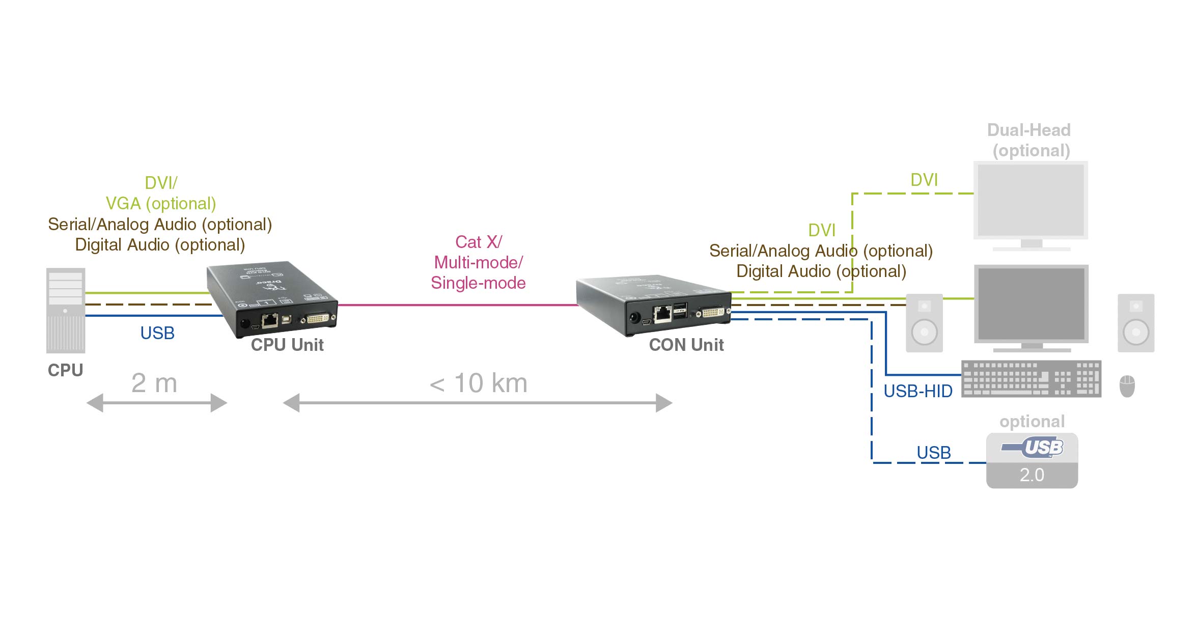 The standard version allows operation of a remote workstation with a HDMI/DVI-D monitor and two USB-HID devices (such as a keyboard and mouse)