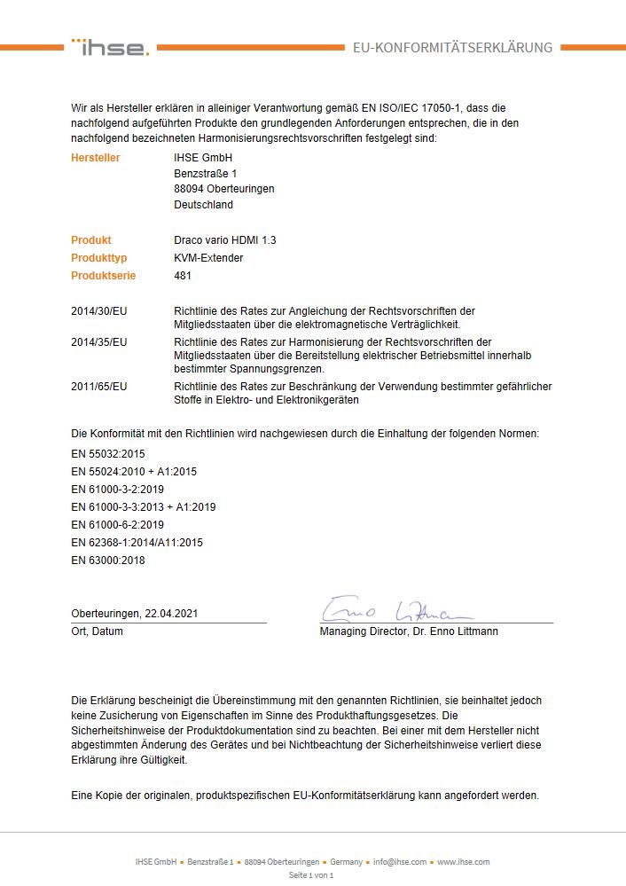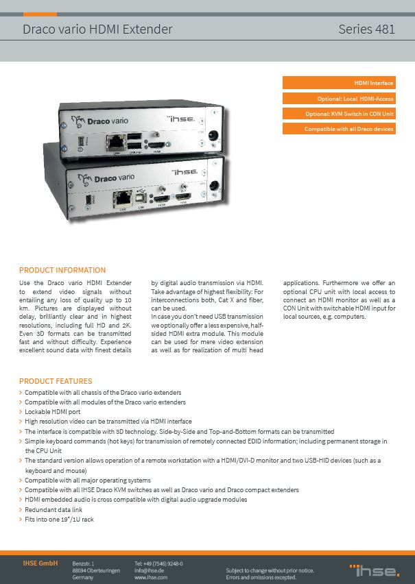 Compatible with all IHSE Draco KVM switches, Draco vario and compact extenders, Draco vario chassis and modules