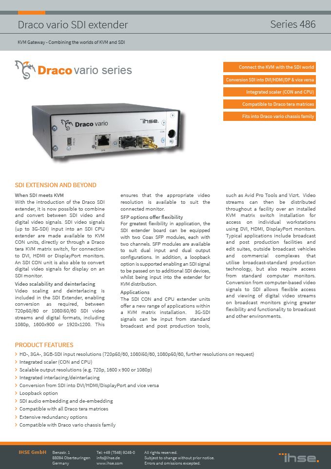 With the introduction of the Draco SDI extender, it is now possible to combine and convert between SDI video and digital video signals. SDI video signals (up to 3G-SDI) input into an SDI CPU extender are made available to KVM CON units, directly or through a Draco tera KVM matrix switch, for connection to DVI, HDMI or DisplayPort monitors. An SDI CON unit is also able to convert digital video signals for display on an SDI monitor. Video scaling and deinterlacing is included in the SDI extender, enabling conversion as required, between 720p50/60 or 1080i50/60 SDI video streams and digital formats, including 1080p, 1600×900 or 1920×1080. This ensures that the appropriate video resolution is available to suit the connected monitor.