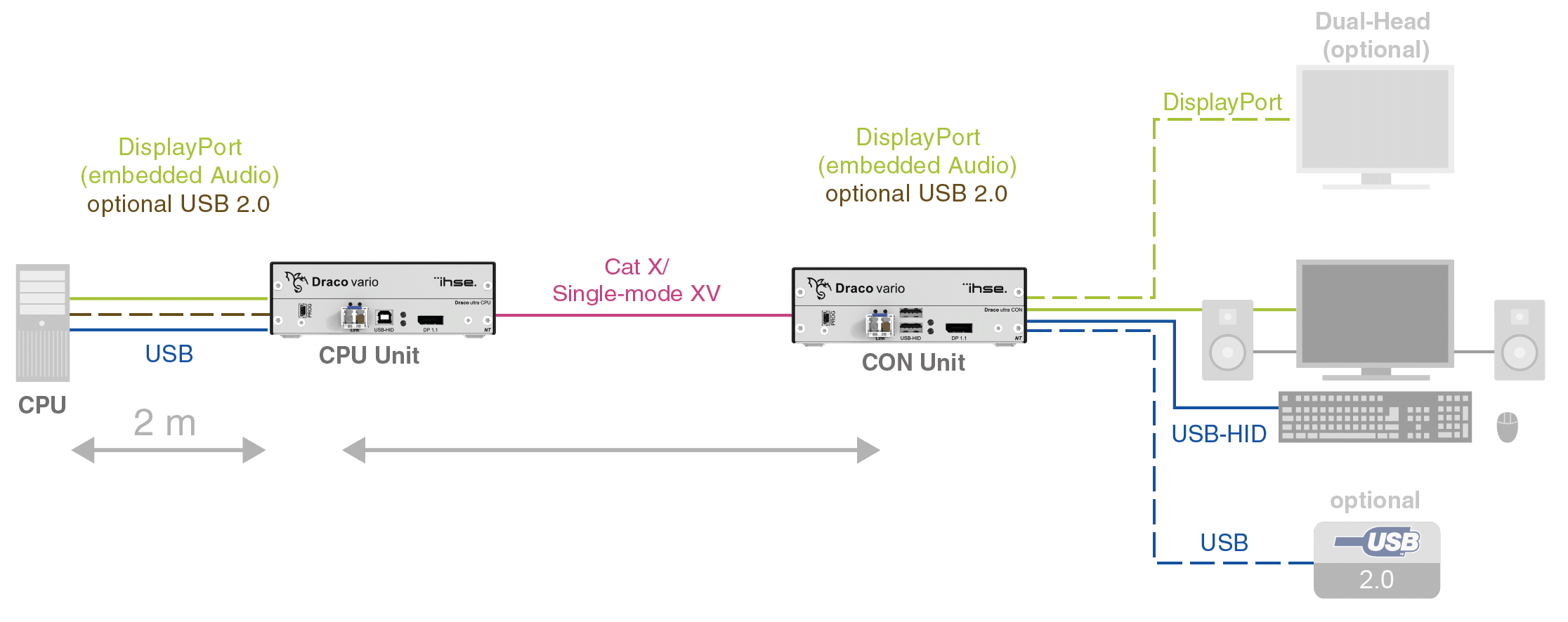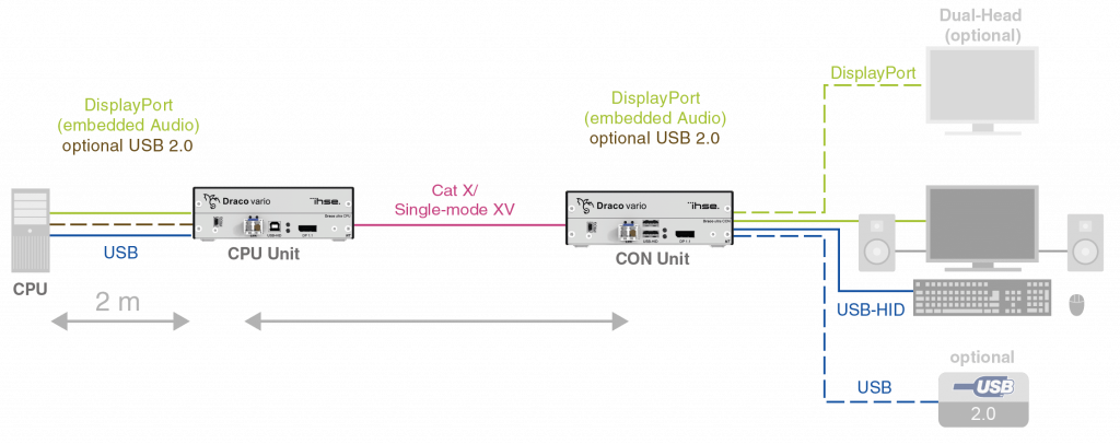 The Draco vario ultra DisplayPort 1.1 extender enables video transmission of two DisplayPort including keyboard and mouse signals over a single duplex fiber optic cable or a Cat X cable and includes keyboard and mouse control. This reduces the complexity of an installation, saves cost, space, cabling and reduces the need for matrix ports in a KVM matrix switch installation.
