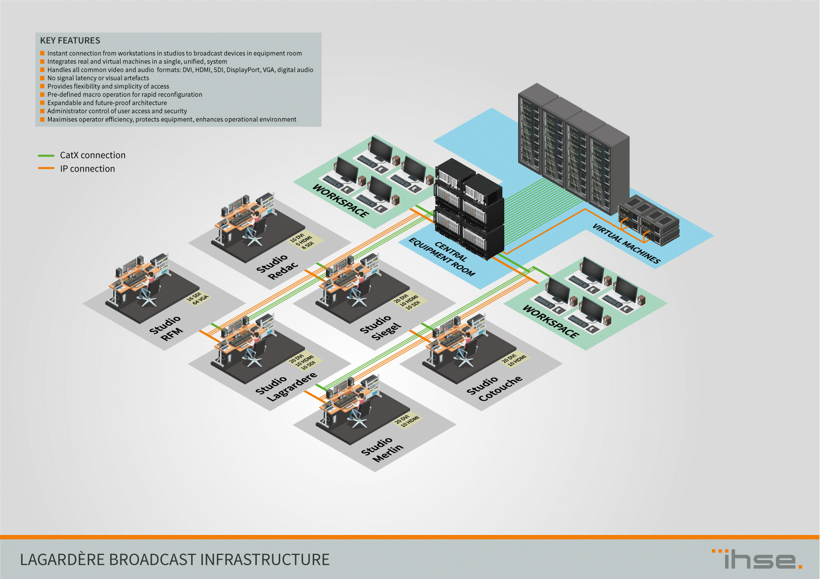 Michael Allouche, Responsable Exploitation, summarised the project: “There are many advantages provided by the IHSE KVM matrix switch system. We have full virtual machine management, can ingest and distribute SDI video as well as high-definition digital audio and have full audio capability.