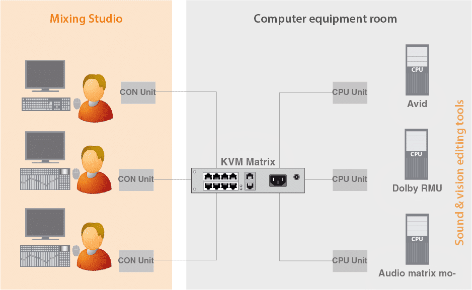 Loudness Films selected a Draco tera compact 8-port KVM switch that enables individual editors and mixers access to essential editing tools from their individual workstations. Using simple keystrokes, each workstation can be instantly connected to any source device. All processing equipment is located around 30 meters away in a dedicated and environmentally-controlled computer room and interconnected over Cat 6 cables.