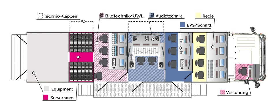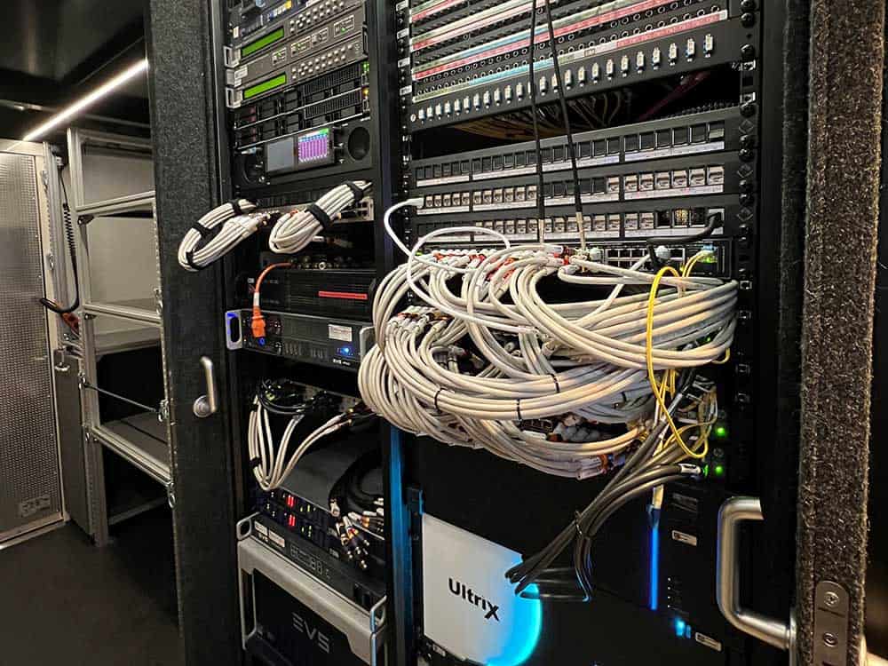 A compact Draco tera flex KVM matrix switch with 32 freely assignable inputs and outputs connects all production workstations with the broadcast devices, servers and tools in the central equipment room of the vehicle. These include several EVS servers, Avid and Adobe Premiere editing systems, a Lawo mixing console and a Riedel communications system.