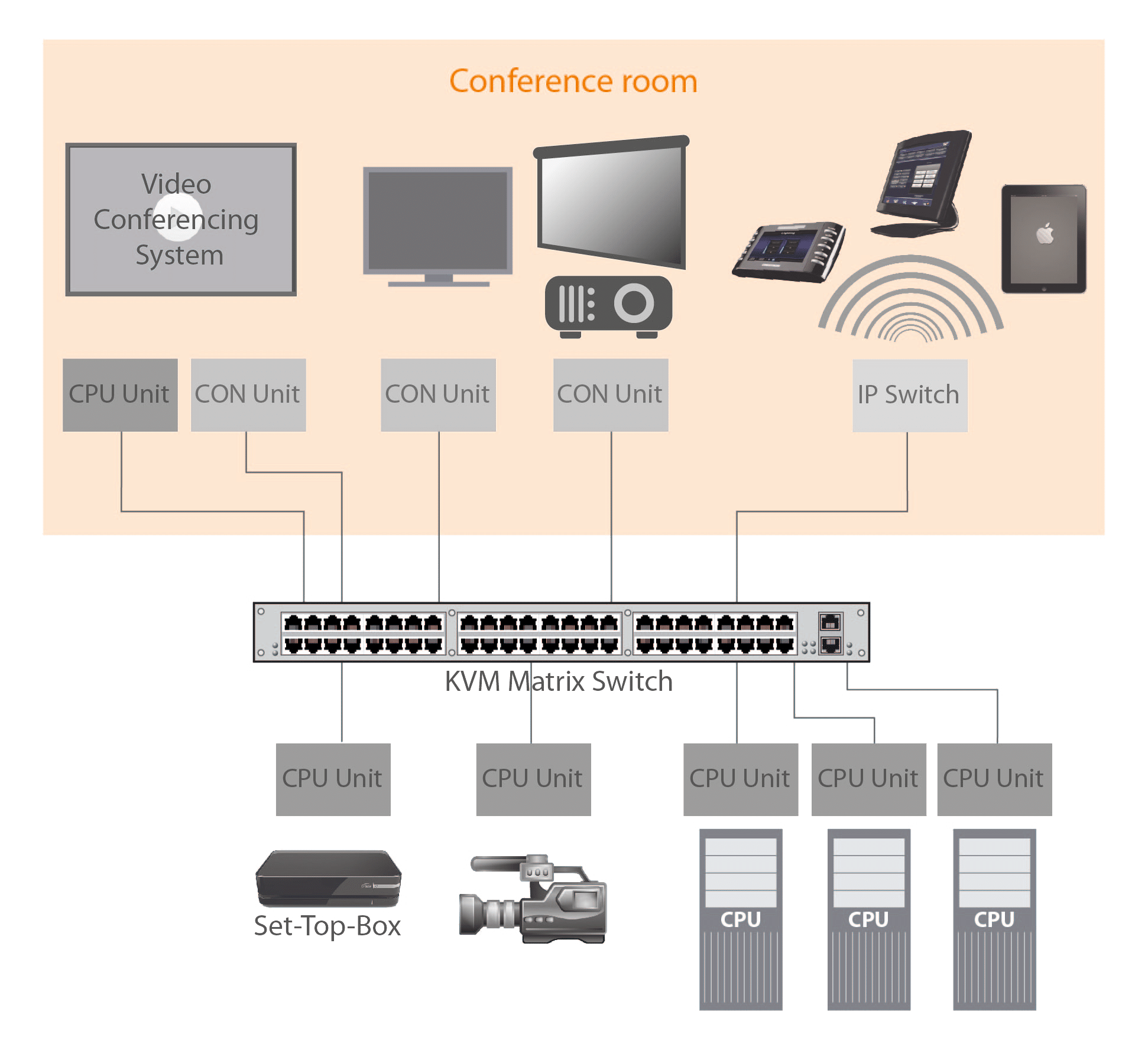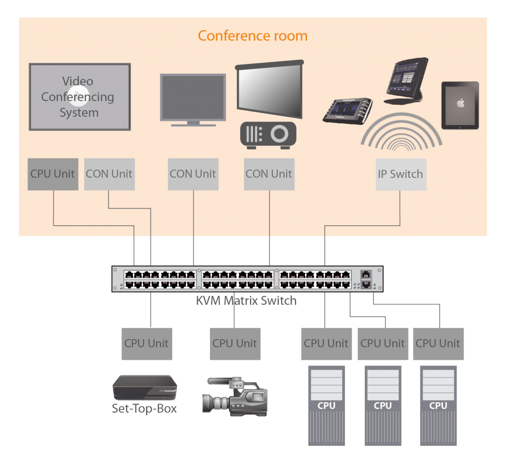 A dedicated video conferencing system is directly connected through a CON Unit and a CPU Unit, enabling bidirectional data distribution. Digital KVM signals, received from remotely located sources, can be transferred to an Extron sound system, while video data produced in the conference rooms, is transmitted to the matrix providing access for all receiving devices.