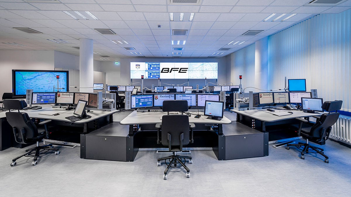 Large technical and organizational development projects are being carried out in Rhineland-Palatinate. This includes the management and situation center of the Mainz Police HQ as a central service and management center for all organizational units as well as an interface for the public, authorities, and institutions. An overhaul was required to adapt to structural developments and new digital technologies. The Mainz Police HQ was therefore tasked with developing a new video and visualization concept that will be able to handle current and future requirements. As a general contractor, BFE assumed responsibility for the planning, installation, and initial startup.