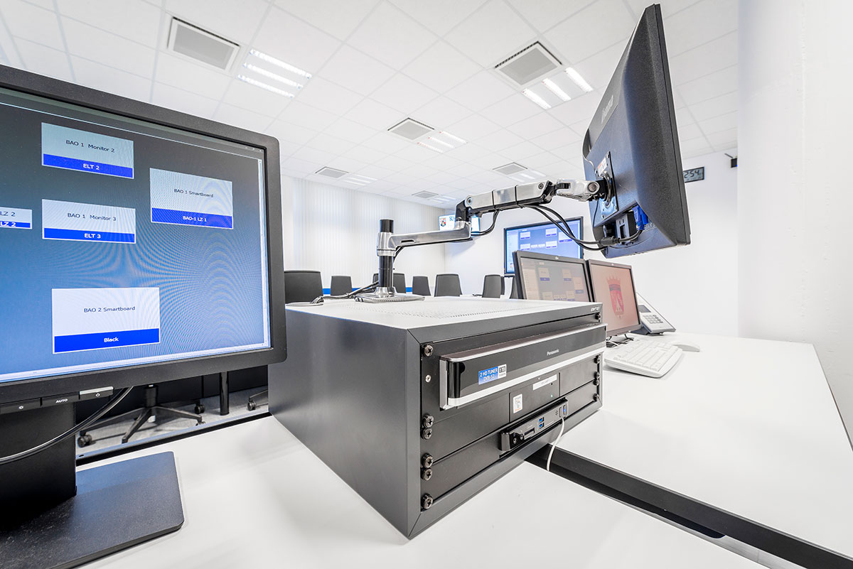 In addition to large-scale display surfaces, additional display surfaces were also implemented in the deployment rooms. A central KMV matrix and connection components allow flexible usage possibilities. Control is simple to manage via the BFE ControlRoom visualization system, which connects all defined signal receivers and distributes the status information and signaling of all connected devices. Confirmations are always sent in real status.