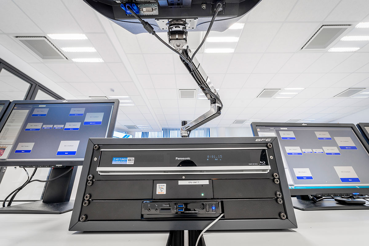 • Large-scale display surface fitted with 12 displays. The monitor wall is designed as a split wall and is equipped with redundant controller computers. This prevents single-point-of-failure displays if the screen controller fails. The remaining components continue to work