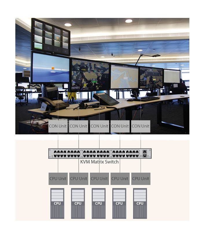 A Draco U-switch at each station enables a single mouse and keyboard operation to be used over several independent displays, reducing desk clutter to a minimum and maximizing operator efficiency and responsiveness: in high-stress situations requiring rapid response, operators do not have the time to search for the correct keyboard and mouse amongst many on their desk. Extension of the workstations to the distant server room is achieved over fiber or Cat 6 cabling.