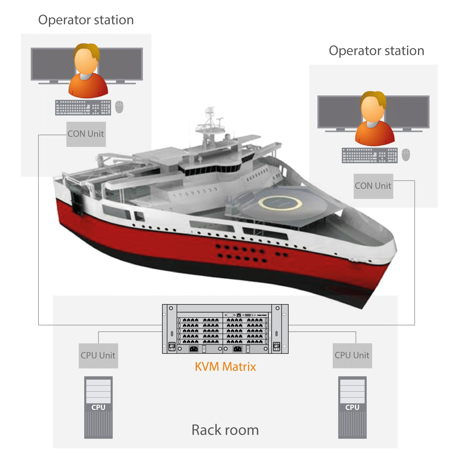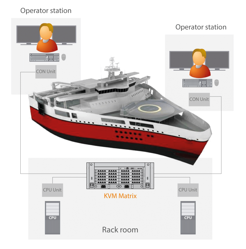 The KVM switches are located alongside the computers in the rack rooms. Marine-grade Cat 7 cabling is run throughout the ship, enabling individual operators to connect to specific computers to access the data they need. The operators are spread around different decks but all need to be able to instantly connect to the appropriate computer and access data with no switching or transmission delay; a task undertaken by the Draco tera switches with ease. Each operator can change the source computer quickly and easily using dedicated keyboard function keys, whilst the system administrator can manage the full system from his own terminal, setting access restrictions and defining routes as necessary.