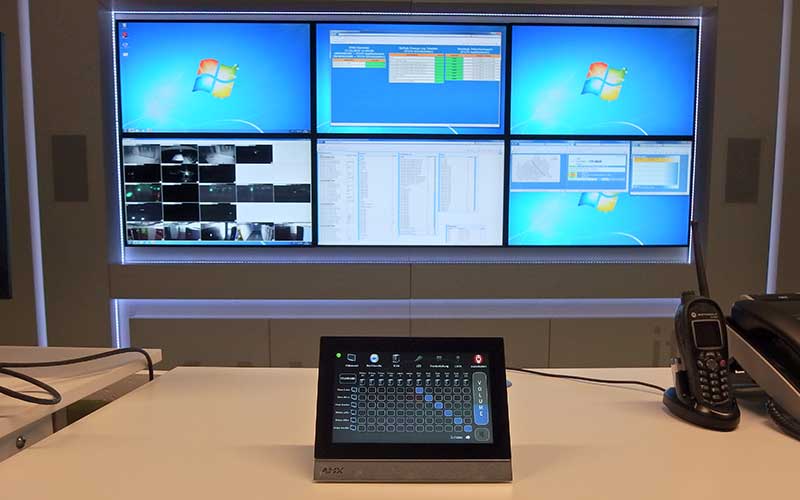 A 32-port Draco tera KVM matrix switch enables the IT staff within the control room to choose which of the available computer or CCTV video sources they wish to show on the 3 x 2 videowall and on the displays within the personal workstations. Selection is simplified by means of an AMX touch screen control panel with a dedicated icon-based user interface. Pre-defined and stored display configurations allow rapid response situations to be addressed. In emergency situations operators can immediately switch to the pre-defined display configuration and instantly display the pertinent information on all screens. This also extends to the indicator LED illumination around the videowall itself which switches the status color depending upon the situation.