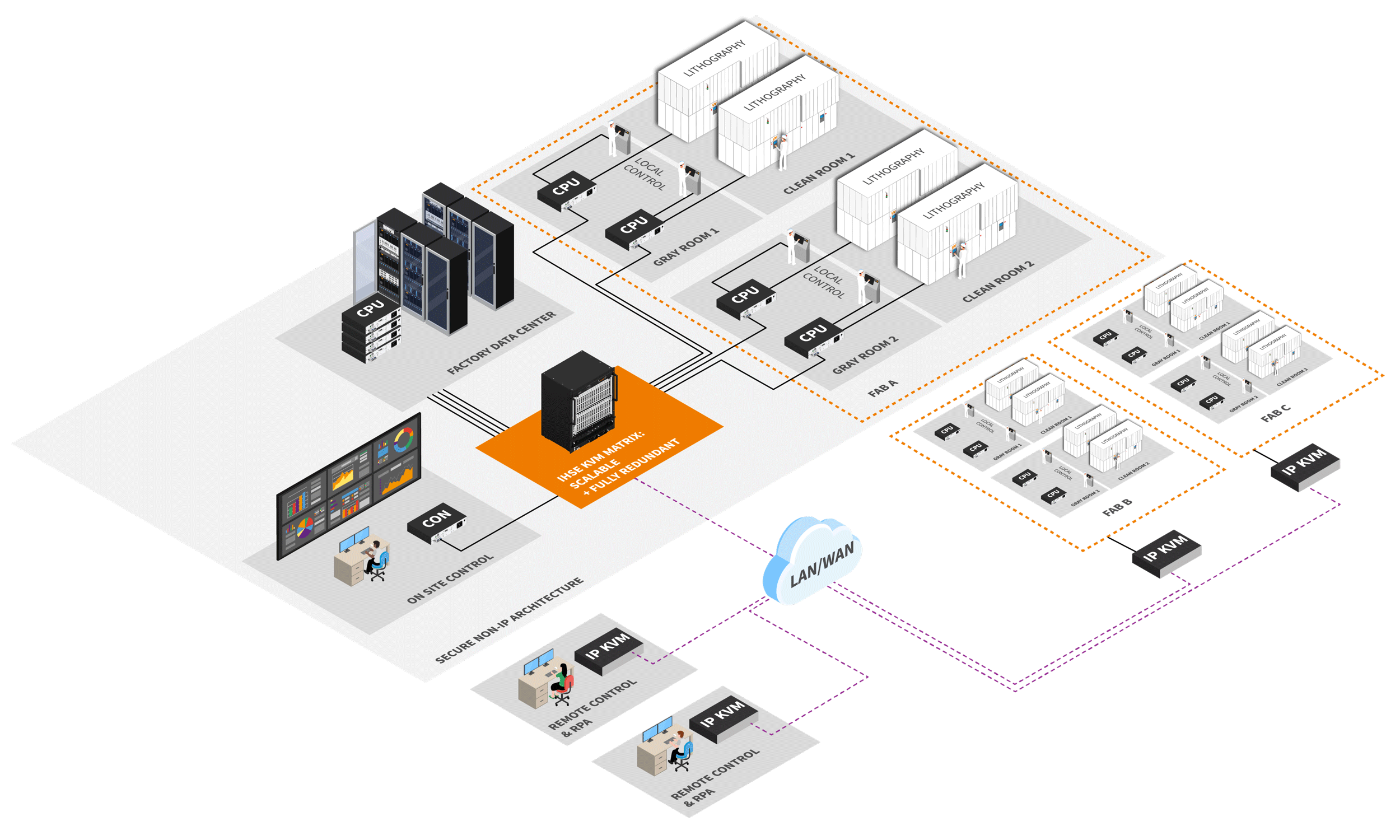 IHSE KVM (Keyboard, Video, Mouse) solutions are designed to meet the stringent demands of semiconductor fabs, offering a range of benefits that enhance operational performance and safeguard sensitive operations.