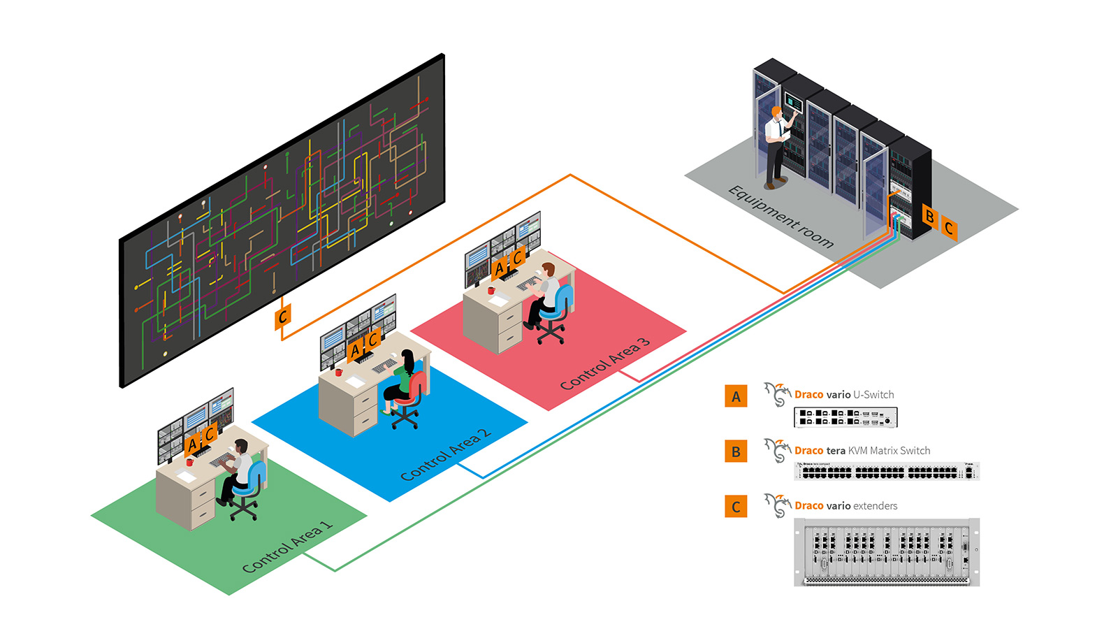 Electricity suppliers, internet providers, transport companies and other organizations need to manage huge amounts of information in centralized control rooms. Operators constantly monitor situations and processes on banks of displays, analyzing data and responding instantly. Rapid processing of mission-critical data is crucial. To achieve this, advanced KVM technology is used to provide full and instant access to remote computers and video sources, whatever the type of signal.