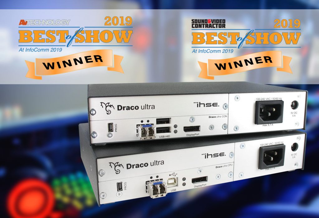 The Draco ultra DP 240 esports KVM extender and R488 Secure IP Remote Access Gateway — both high-end KVM (keyboard, video, mouse) display management solutions from IHSE — were honored with Best of Show awards at InfoComm 2019.
